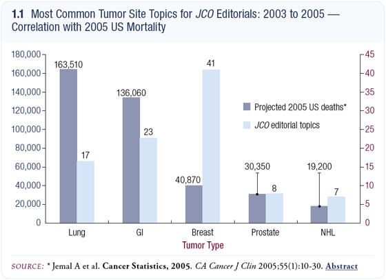 The compelling pieces by Sandra Horning on rituximab monotherapy in B-cell lymphoma and Richard Fisher on mantle cell lymphoma are also noteworthy because NHL is a relatively rare topic for JCO editorials. A quick perusal of work published in the last two years is quite telling, as there is a clear emphasis on breast cancer (1.1).